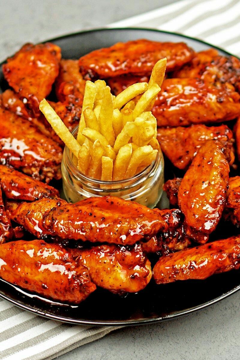 Deliciosas alitas broaster bañadas en salsa picante acompañadas de papas nativas
