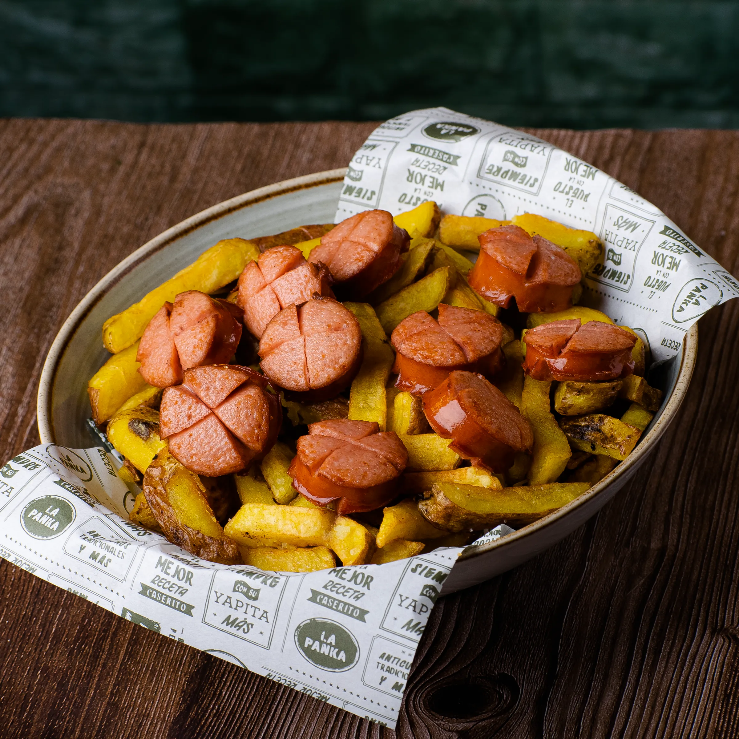 Deliciosas salchichas ahumadas , salchicha arequipeña y chorizo parrillero fritos y cortados en rebanadas acompañadas de papas nativas